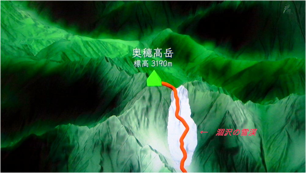 立体 MAP で横尾の左方向に見える白い雪渓が涸沢・・