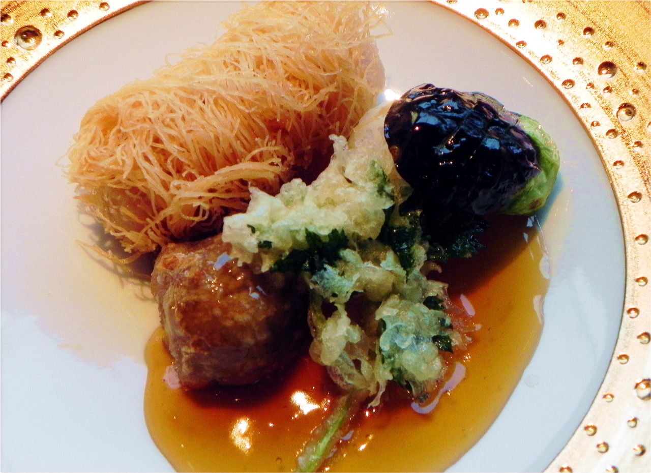金目鯛白糸揚げ 牛蒡饅頭 小切茄子 三つ葉 煮卸し餡